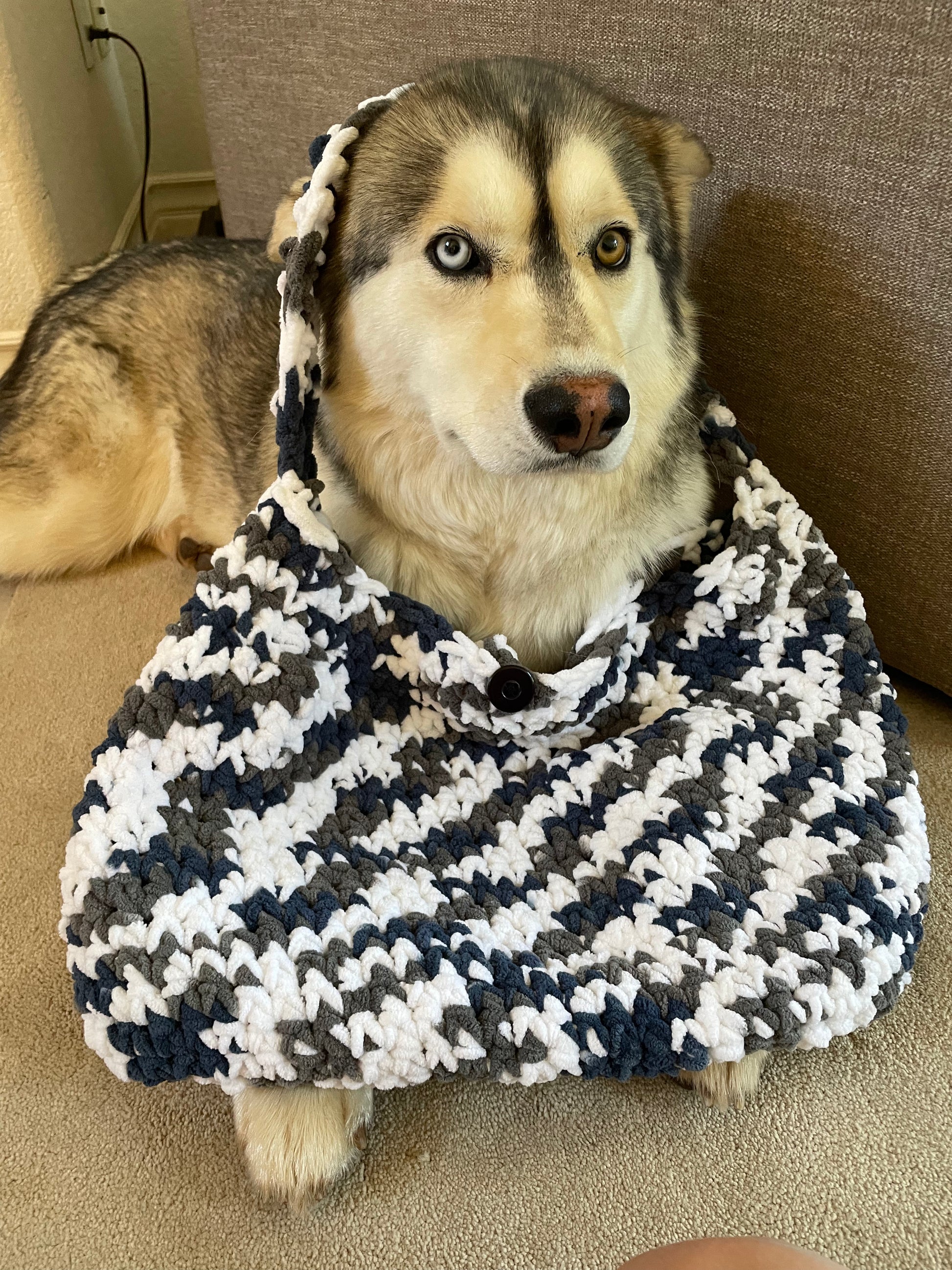 This unique accessory is made with high quality and super soft Bernat blanket yarn. Color: white, gray, and blue. Size small (17.5 inches wide, 11 inches tall).